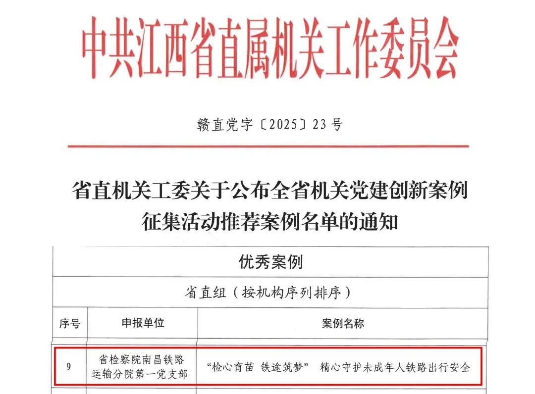 近日,省直机关工委公布全省机关党建创新案例征集活动推荐案例名单,南铁检察分院机关党委报送的“‘检心育苗 铁途筑梦’精心守护未成年人铁路出行安全”获评优秀案例。